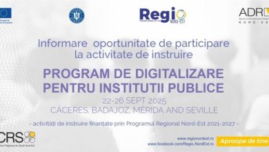 Agenția pentru Dezvoltare Regională Nord-Est, prin Centrul Regional de Studii Nord-Est, vă adresează invitația de a participa la vizita de studiu „EBS – Program de Digitalizare pentru instituții publice”, care va avea loc în perioada 22 – 26 septembrie 2025, în Cáceres, Badajoz, Merida si Sevilia (Spania). Activitatea de instruire are ca temă generală transformarea digitală a administrației publice, cu…