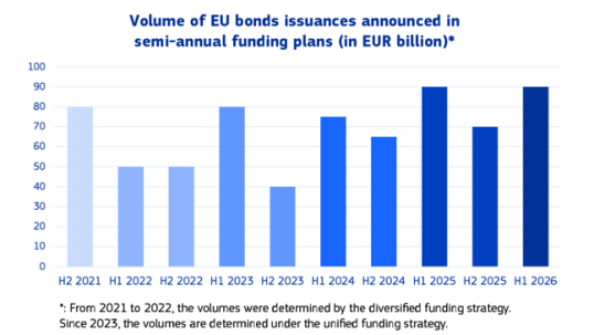 Comisia Europeană și-a anunțat intenția de a emite obligațiuni ale UE în valoare de până la 90 de miliarde EUR în prima jumătate a anului 2026, aducând obligațiunile UE restante la aproape 800 de miliarde EUR până la sfârșitul lunii iunie 2026.