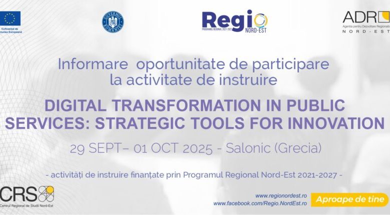 Agenția pentru Dezvoltare Regională Nord-Est vă informează despre oportunitatea de participare la activități de instruire identificate ca fiind utile în procesul de creștere a capacității instituționale a beneficiarilor Programului Regional Nord-Est 2021-2027. Astfel, puteți înscrie o persoană angajată în instituția dumneavoastră care să participe, în perioada 29 septembrie – 1 octombrie 2025 la cursul intitulat Transformarea digitală în serviciile publice: instrumente strategice pentru inovare (Digital Transformation in Public Services: Strategic Tools for Innovation) furnizat de European Academy, in Salonic, Grecia.