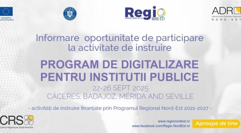 Agenția pentru Dezvoltare Regională Nord-Est, prin Centrul Regional de Studii Nord-Est, vă adresează invitația de a participa la vizita de studiu „EBS – Program de Digitalizare pentru instituții publice”, care va avea loc în perioada 22 – 26 septembrie 2025, în Cáceres, Badajoz, Merida si Sevilia (Spania).